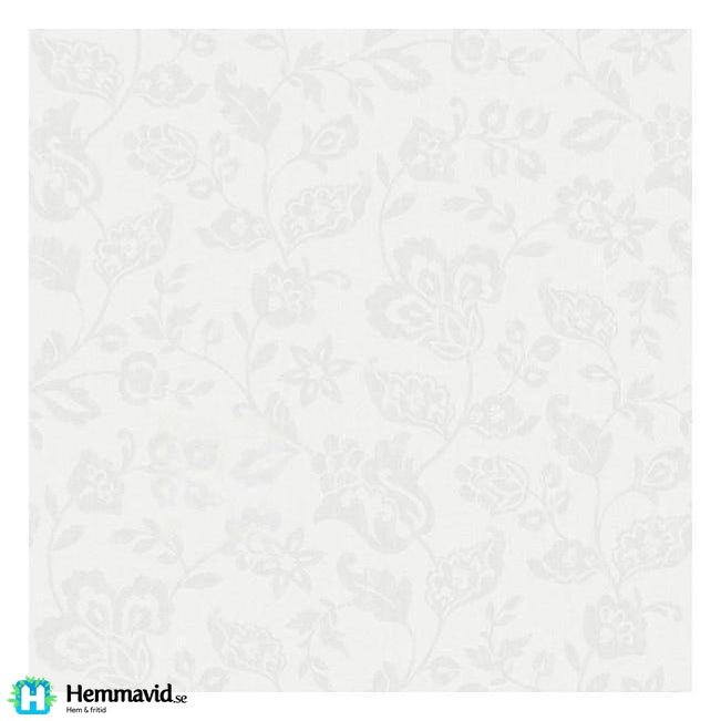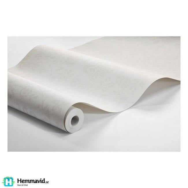 En ljus, storblommig tapet med ett klassiskt blomsterornament på vår populära textilyta. Ett harmoniskt och välbalanserat mönster som detta passar fint på rummets alla väggar. Färgskalans mjuka kontraster med benvitt och ljusgrått ton i ton bidrar också till den lugna känslan. En vacker EasyUp-tapet som också finns i mjukt blekrosa.