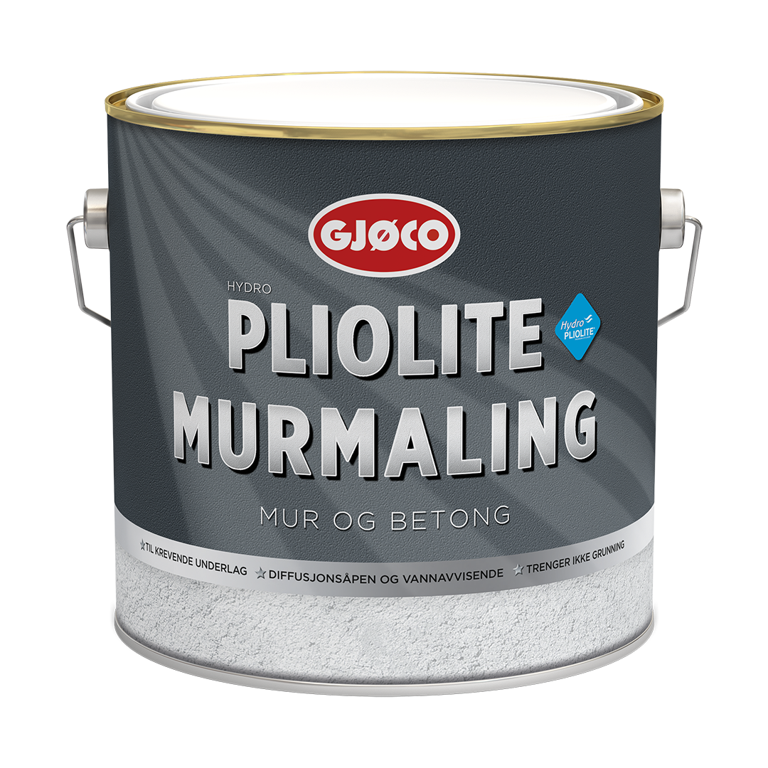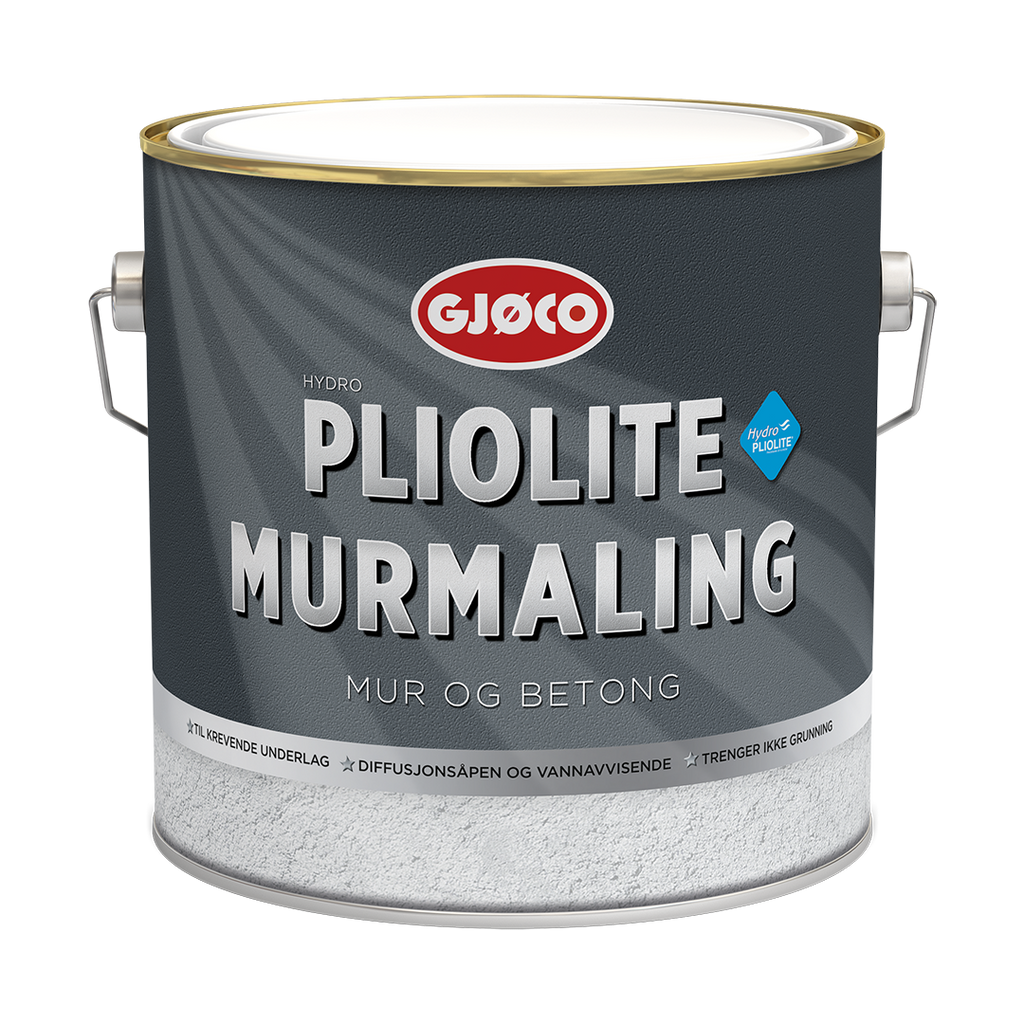 Gjøco Hydro Pliolite Murmaling är en matt, diffusionöppen färg för utomhusbruk på mineraliska underlag. Den har god vidhäftning på svåra ytor och kan användas vid temperaturer ner till + 2 °C. Gjøco Hydro Pliolite Murmaling innehåller filmskyddande antimögelmedel och har mycket god väderbeständighet. Färgen är särskilt lämplig för murverk, betong och puts, både obehandlade och tidigare målade.