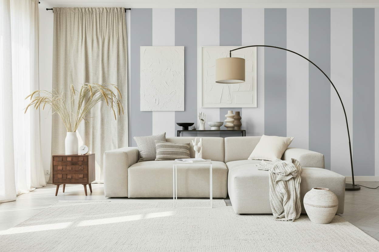 Big Stripes är en bredrandig tapet i vitt och en snygg kontrastkulör är en klassiker som alltid fungerar. Den ger ett stilrent intryck och passar in i de flesta rum. Men att blanda in moderna sköna kulörer kan ge en helt ny dimension åt tapeten och rummet den pryder.