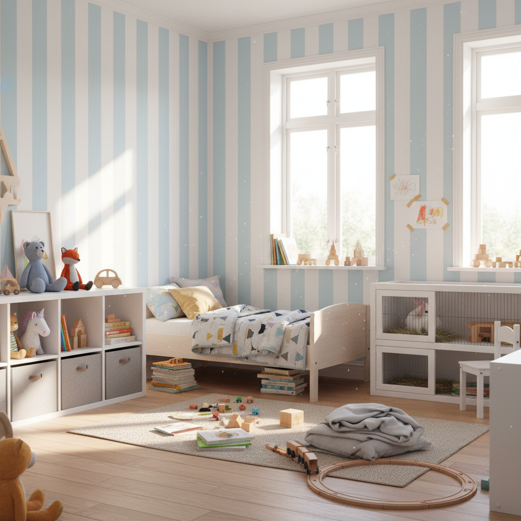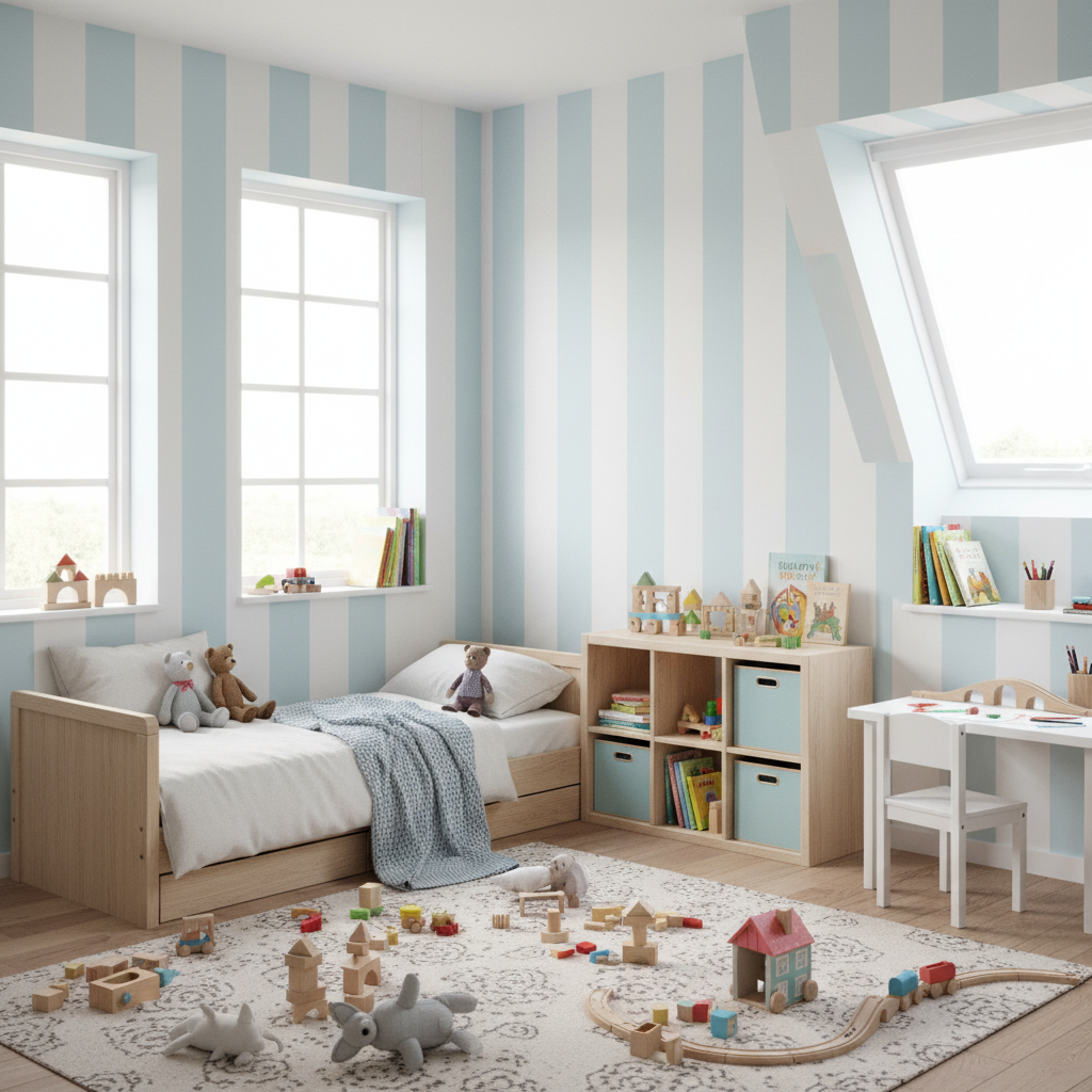 Perfekt för dig som vill skapa en stilren och harmonisk atmosfär i barnrum, sovrum, hall eller kök. De breda ränderna ger rummet visuell höjd och rymd utan att bli överväldigande.