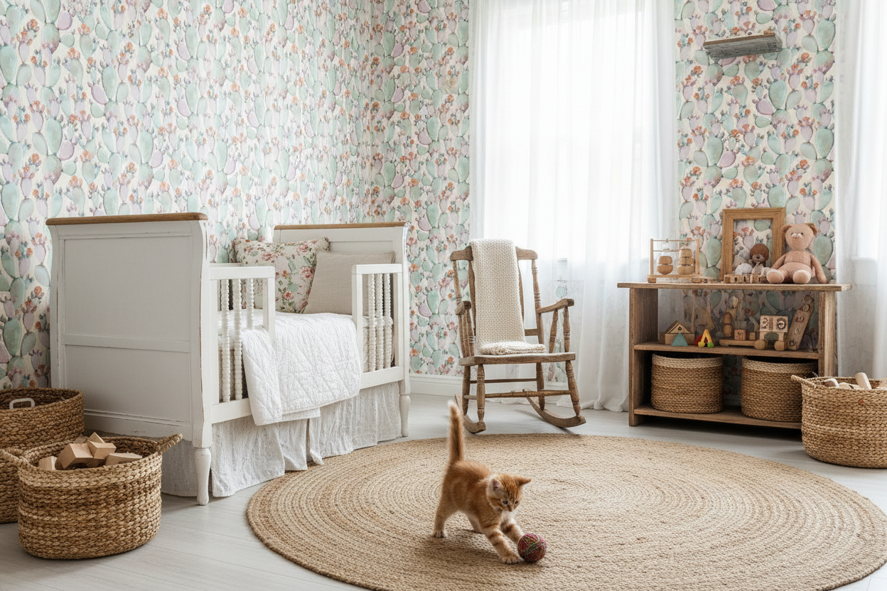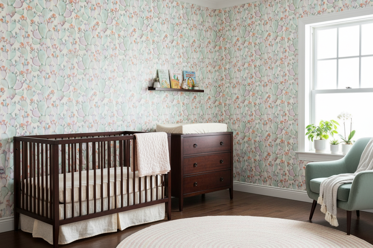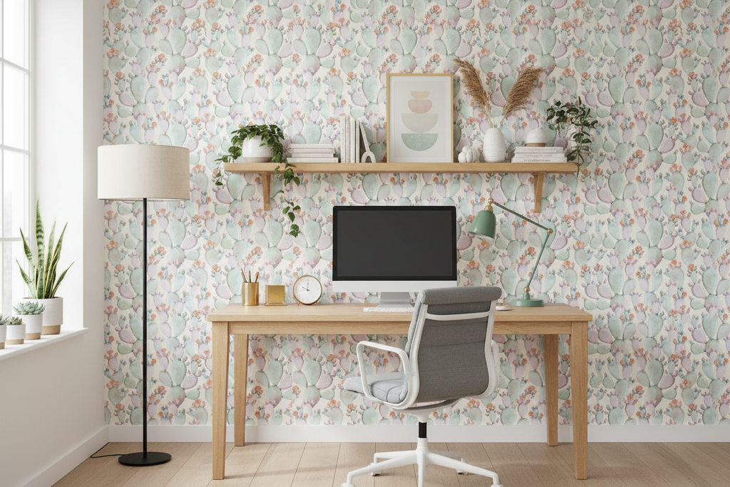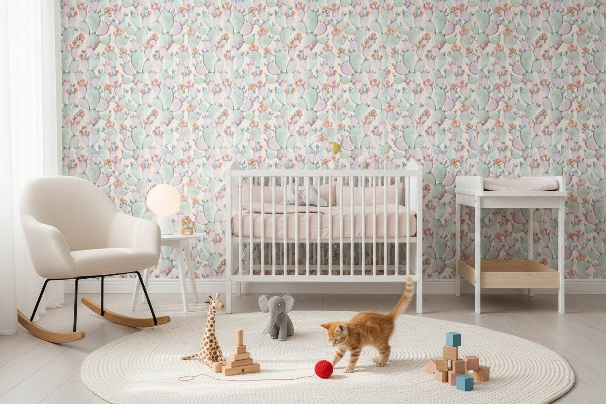 Serene Cactus-tapeten är en riktig dröm för alla kaktusälskare där ute. Den är både vacker och lugnande på samma gång. Den mjuka färgställningen pastell, som hämtats från fantasin, skapar en avslappnad atmosfär i vilket rum den än sitter i.