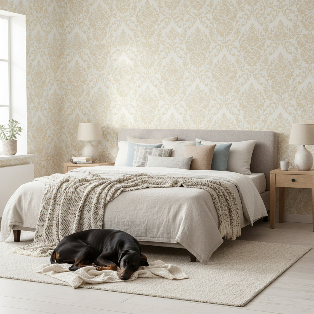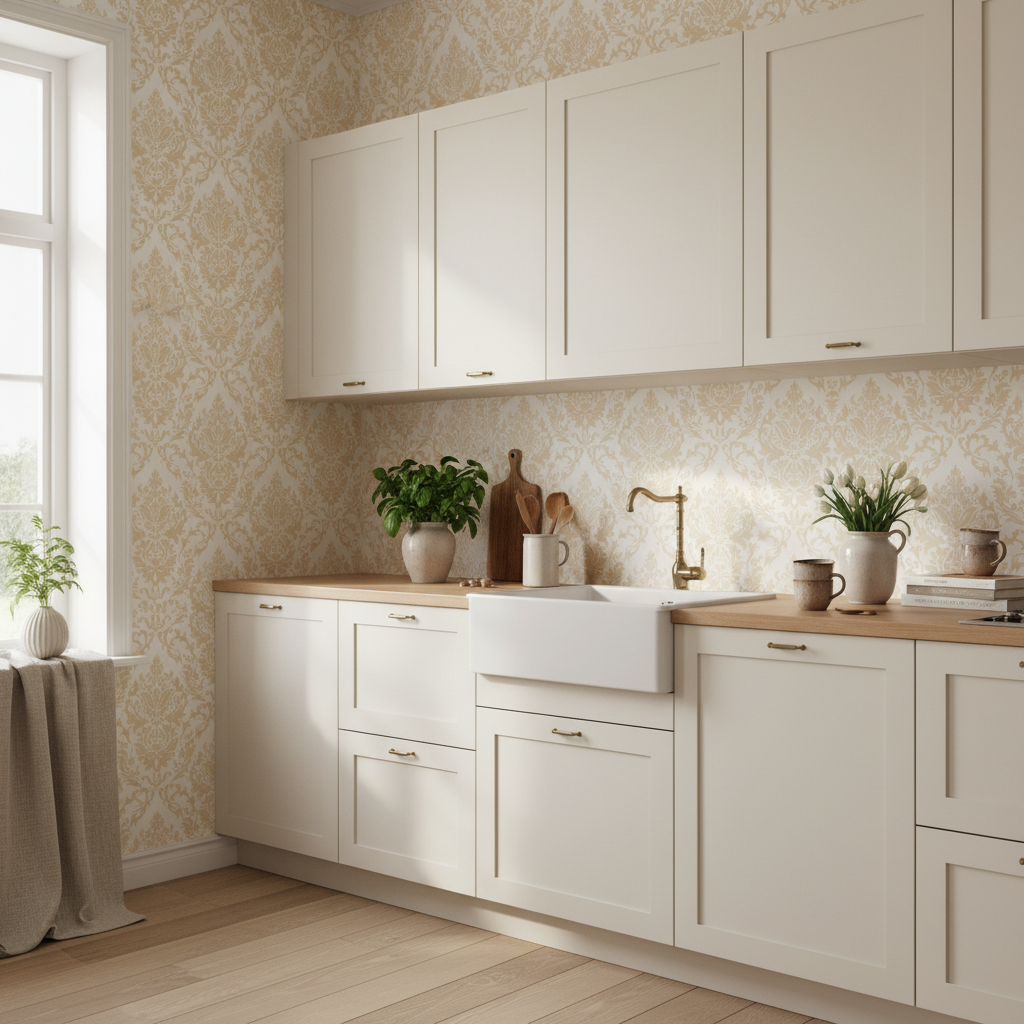 Designad av Mezha P, kombinerar denna tapet traditionell estetik med modern funktionalitet. Det symmetriska mönstret med sina detaljrika ornament ger rummet djup och karaktär, samtidigt som den ljusa färgskalan håller känslan luftig och harmonisk.