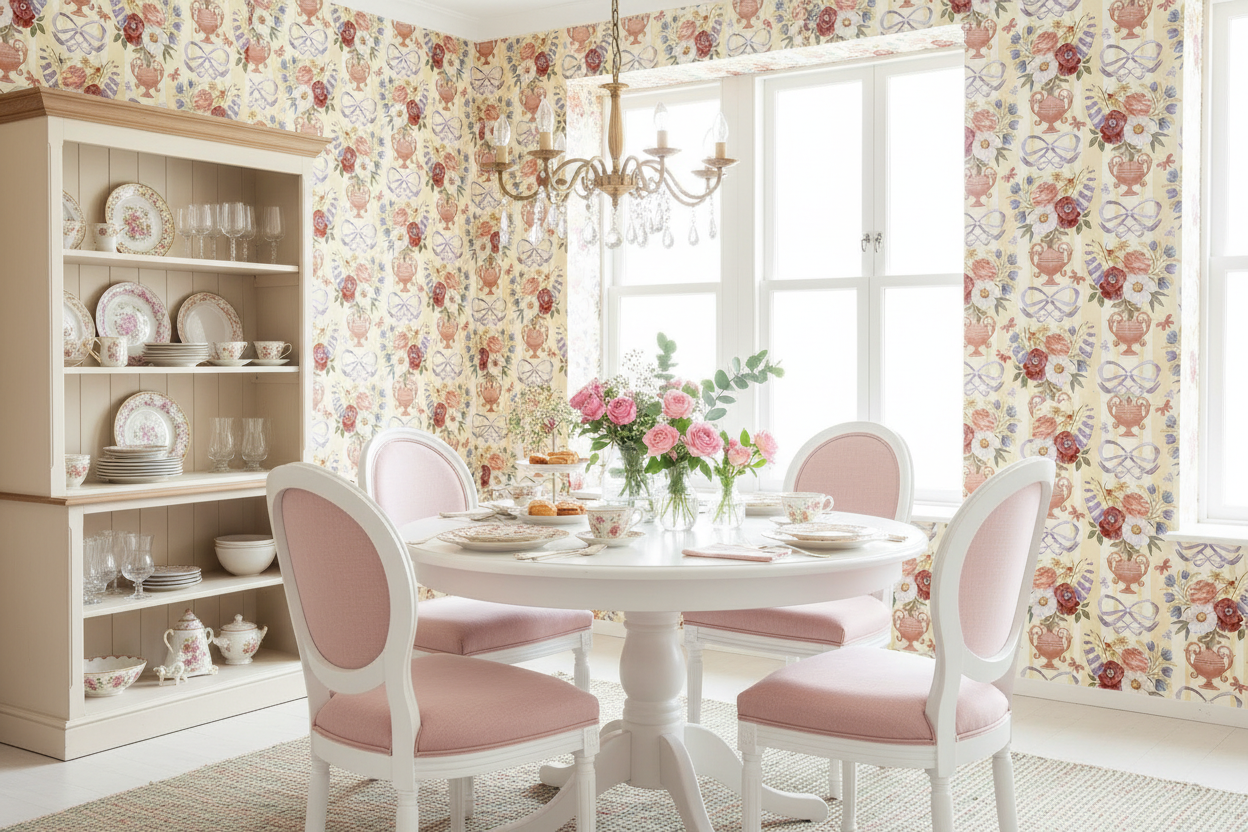 Den här tapeten skulle vara perfekt för att skapa en romantisk och tidlös atmosfär i ett vardagsrum, sovrum eller matsal. De vackra blommorna och dekorativa elementen i mönstret ger liv åt rummet och gör det till en varm och inbjudande plats att vara på.