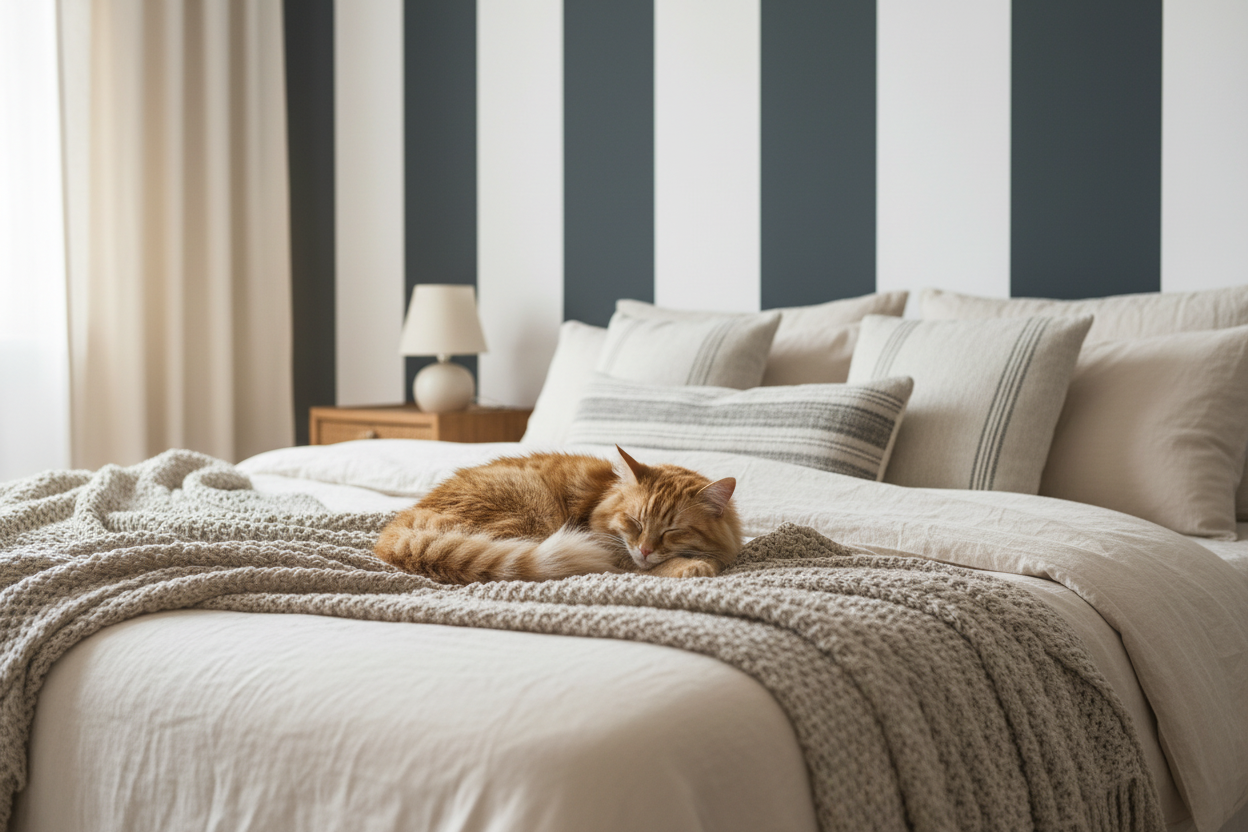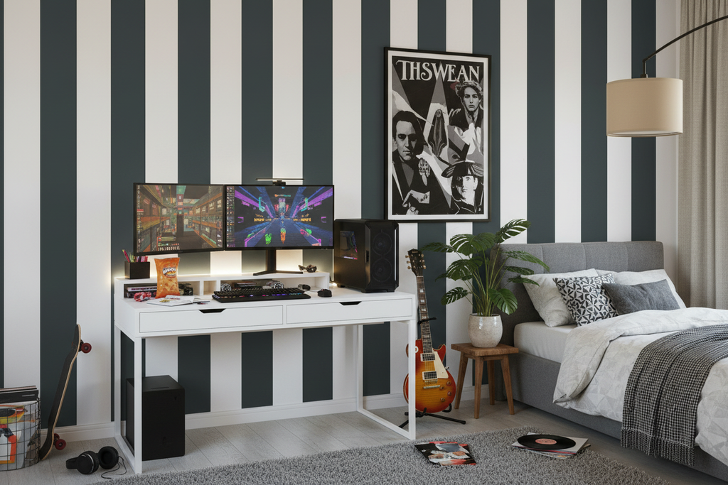 Om du vill ha en mer avslappnad och lekfull stil kan du välja att sätta tapeten vågrätt och kombinera den med moderna möbler och tillbehör i djärva färger. På så sätt kan du skapa en färgglad och personlig atmosfär i rummet.
