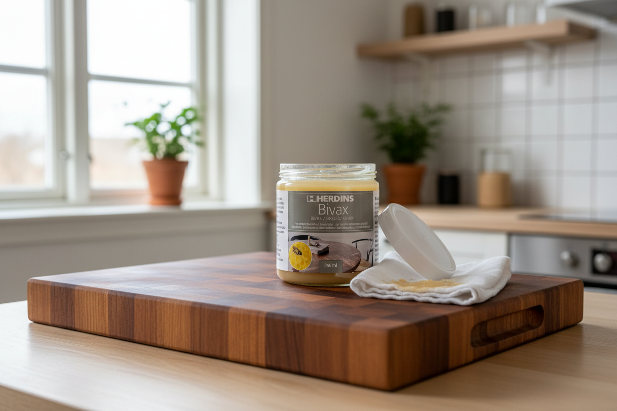 Herdins Bivax är en ofärgad vax som används inomhus på bland annat möbler och skärbrädor – för en gyllene och motståndskraftig yta.